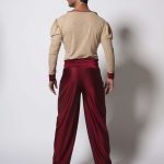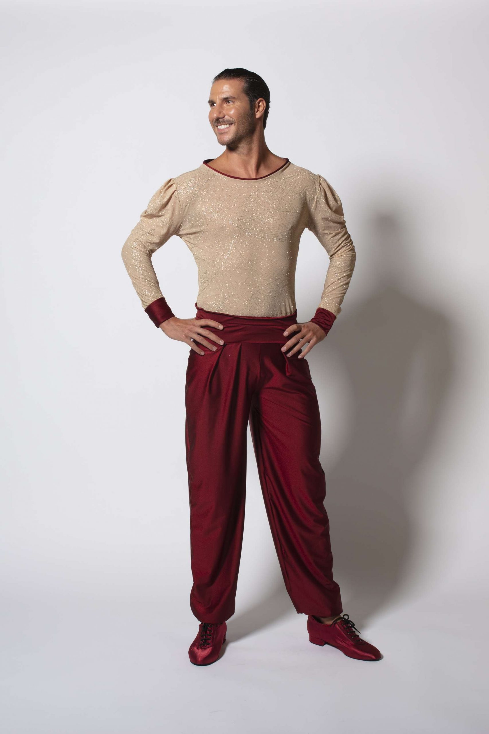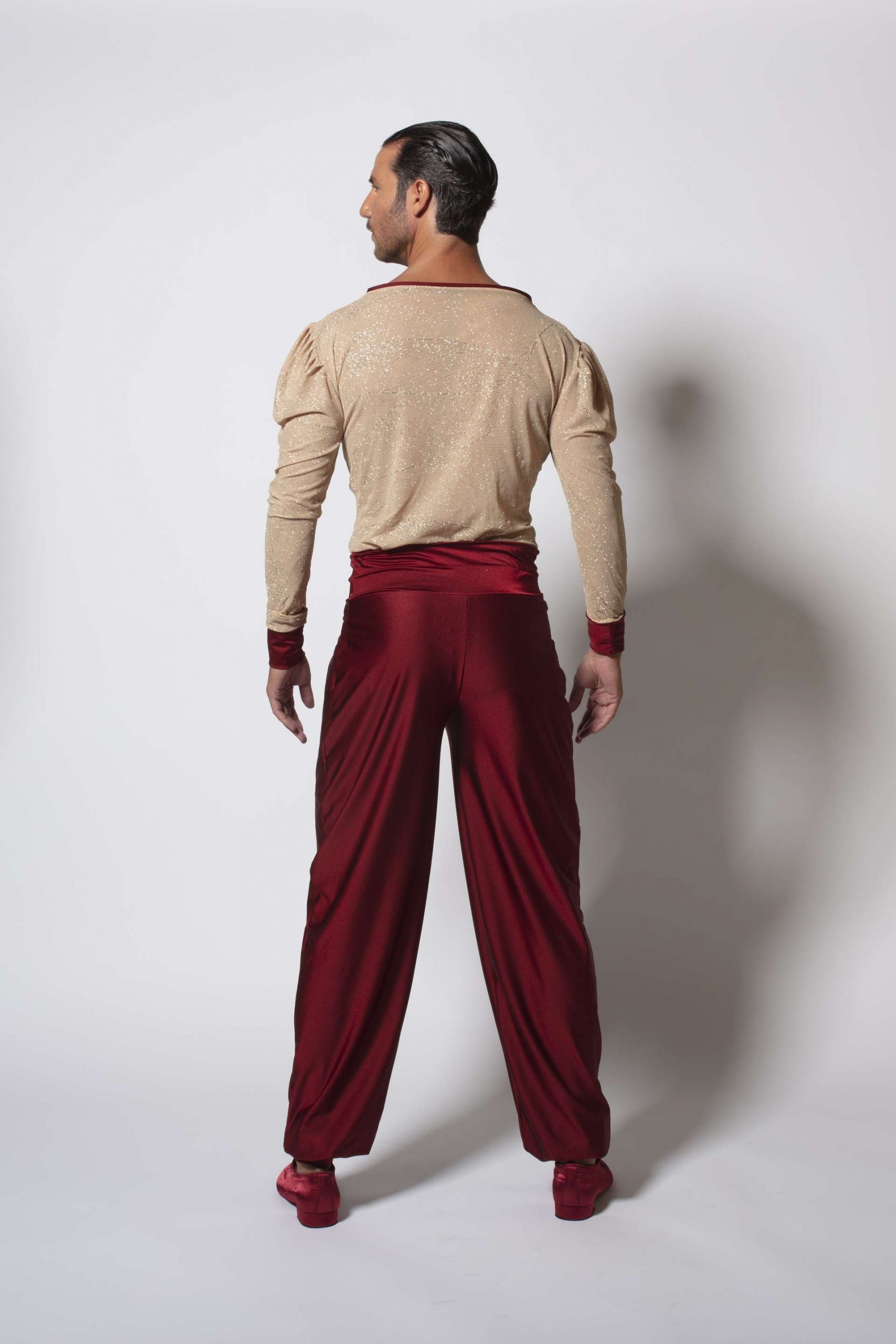 Splendido completo uomo con pantaloni morbidi con pieghe anteriori in lycra bordo‘ lucido abbinato a maglia body maniche a sbuffo in lucente retina Glitter foglia oro, rifinita con bordi e polsini in Lycra bordò.
